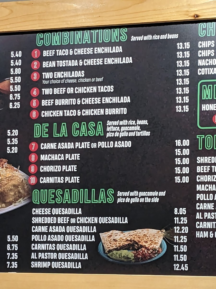 - Entrées & Specialty Dishes: Options like Enchiladas, Chimichanga, Chile Relleno, and Cheese Enchilada provide traditional Mexican main courses.