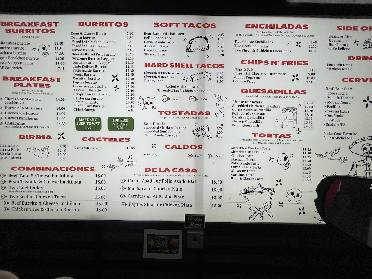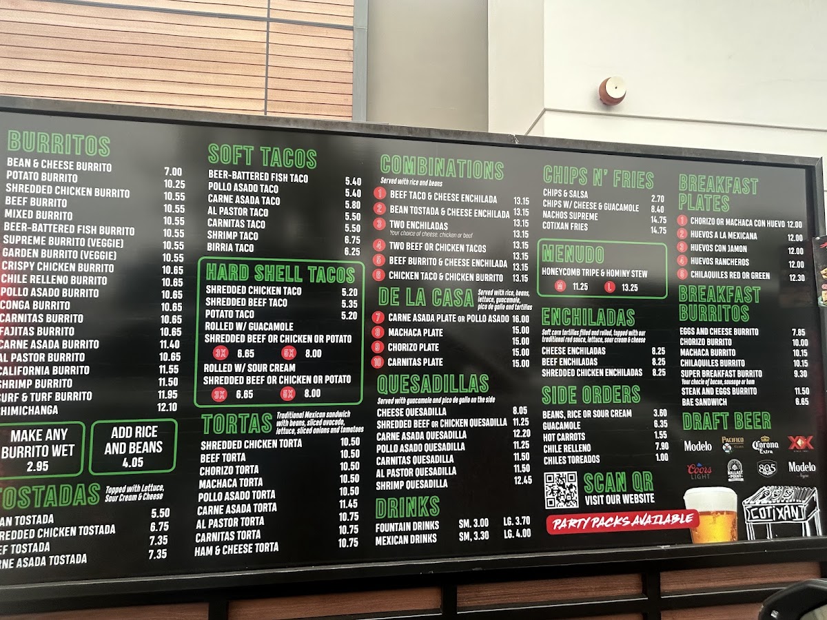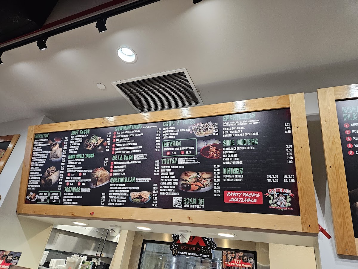The menu at Cotixan Mexican Food offers a variety of Mexican and fast food options suitable for breakfast, lunch, and casual dining throughout the day. The selection features traditional Mexican dishes alongside popular fast food items, allowing for quick order and takeout as well as dine-in service.